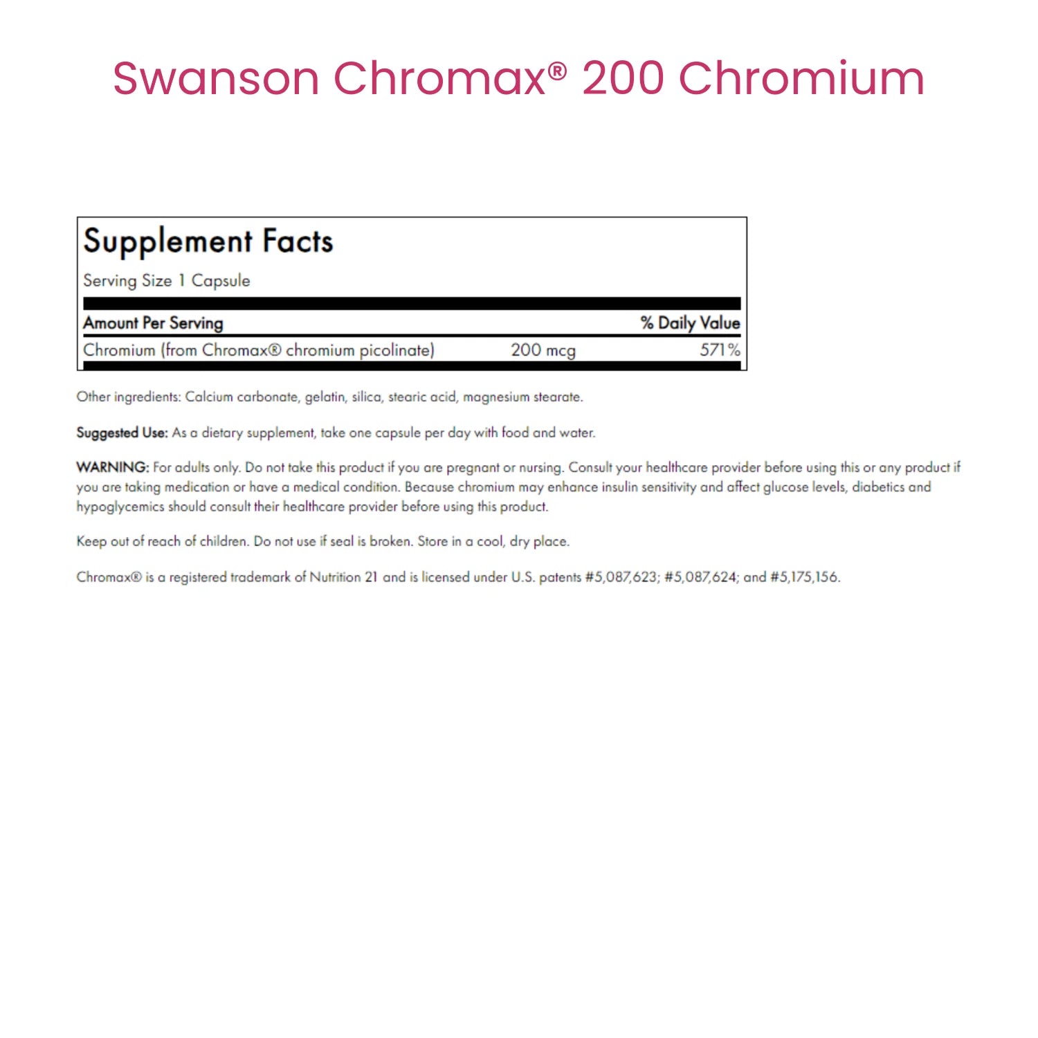 Chromax® 200 Chromium: A patented, clinically studied form of chromium picolinate that supports healthy glucose metabolism and may help reduce cravings and food intake.